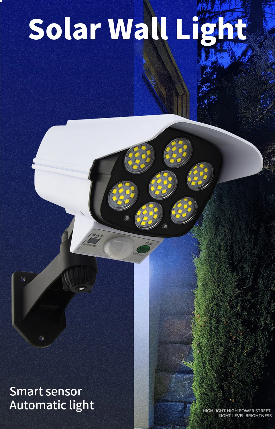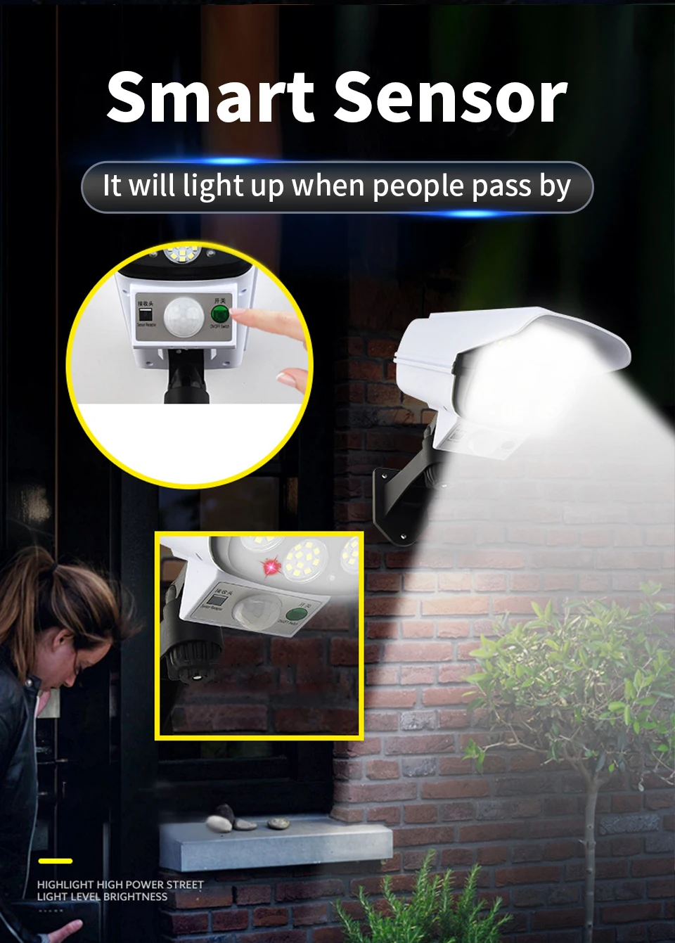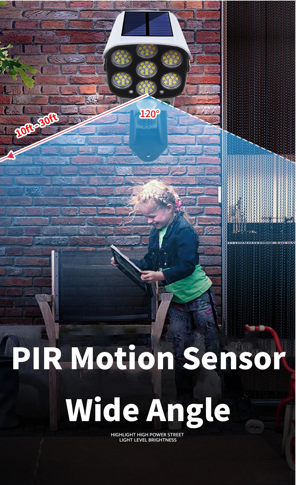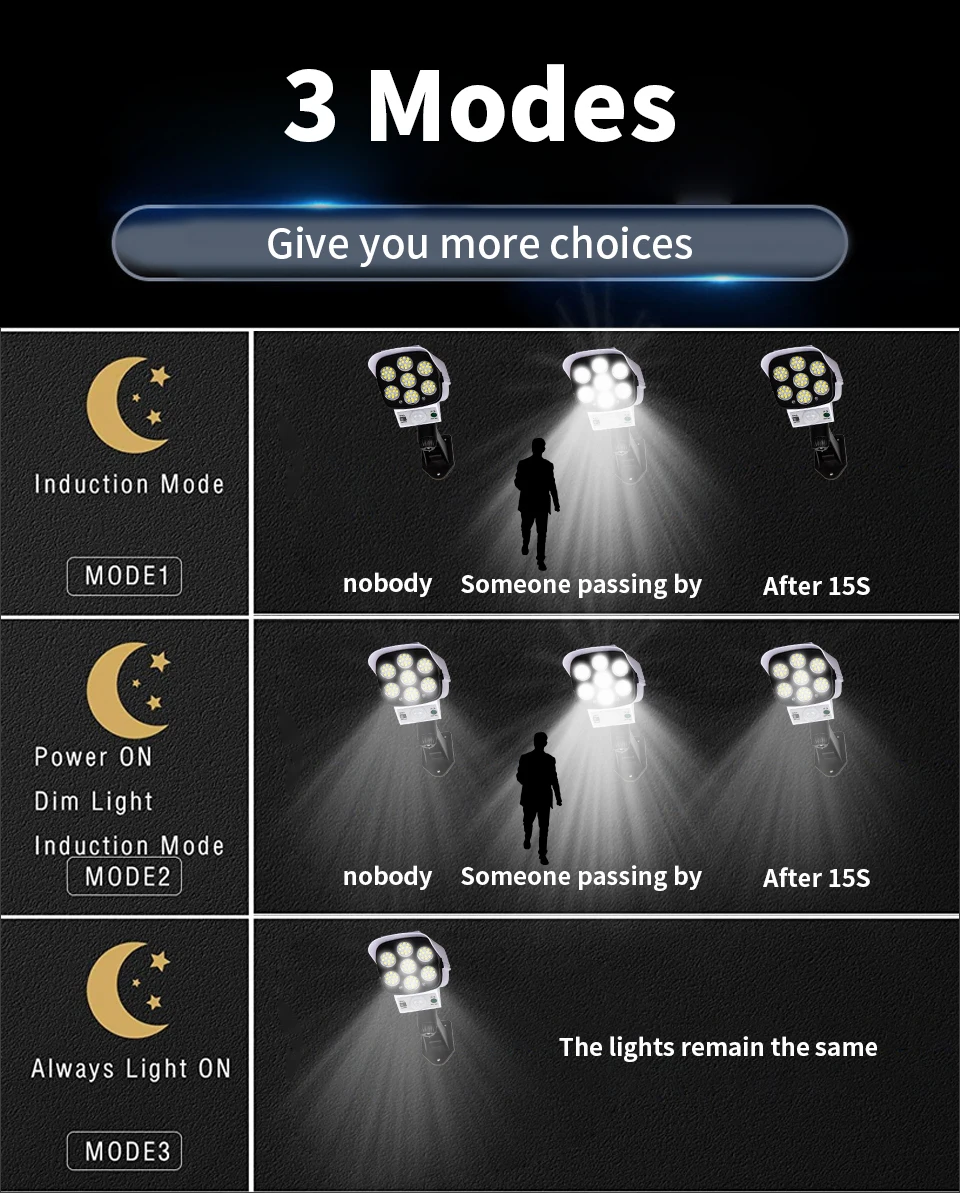 ▪【3 Lighting Mode Optional 】- ① Light off at night, just red light flashing, strong light mode on when motion detected;② Weak light mode at night, strong light mode on when motion detected;③ always light on mode ,red light is always flashing on any mode